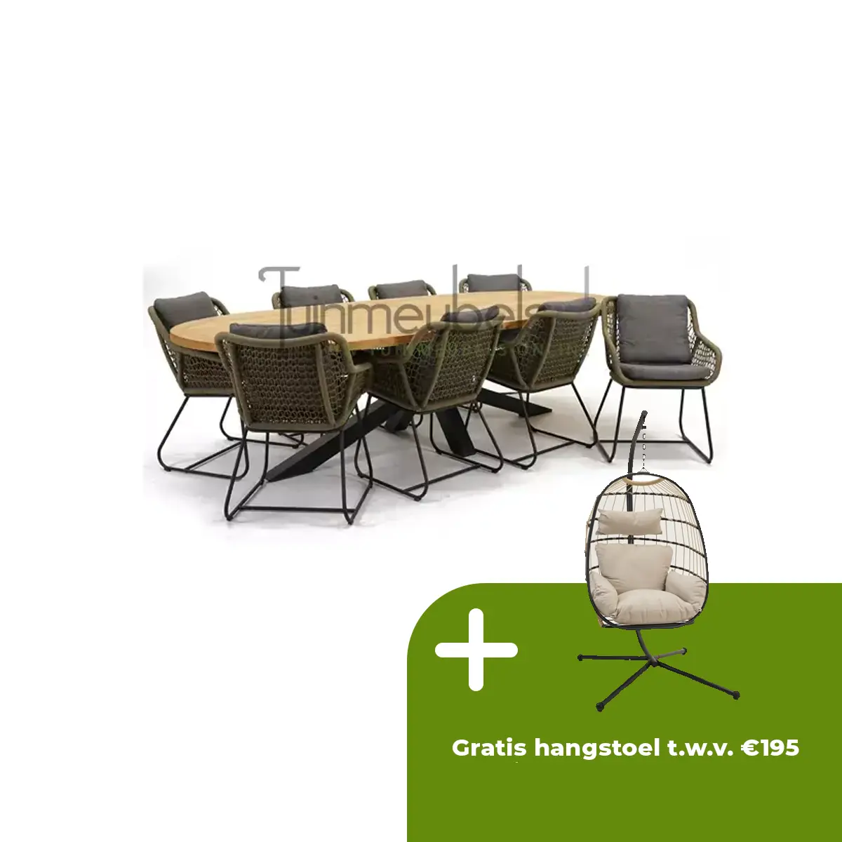 Deze stijlvolle combinatie heeft een mooi kleurenpalet dankzij de mooie Olijfgroene en grijze kleuren van de Portofino stoelen en de teakkleur van de tafel. Dit geeft een stijlvolle impuls aan jouw tuin en dankzij deze pastelkleuren is deze tuinset makkelijk te combineren met eventuele additionele tuinmeubels zoals parasols of terrasverwarmers bijvoorbeeld.
