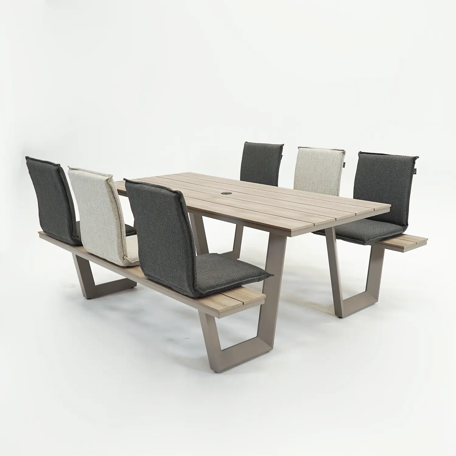 Ben je op zoek naar een stijlvolle en praktische picknicktafel voor je tuin, terras of overkapping? De Vita Massa rechthoekige picknicktafel taupe is een uitstekende keuze. Deze picknicktafel combineert een strak, tijdloos design met een warme taupe kleur, waardoor hij direct sfeer geeft aan iedere buitenruimte. Dankzij het moderne en neutrale ontwerp past hij bij vrijwel elke tuinstijl, van klassiek tot eigentijds. De royale afmetingen van de tafel maken het eenvoudig om samen met familie of vrienden te lunchen, borrelen of dineren. De geïntegreerde zitbanken zorgen ervoor dat alles netjes op elkaar aansluit en dat er geen losse stoelen nodig zijn. Zo ontstaat een gezellige, uitnodigende plek waar iedereen comfortabel plaats kan nemen en optimaal kan genieten van het buitenleven.