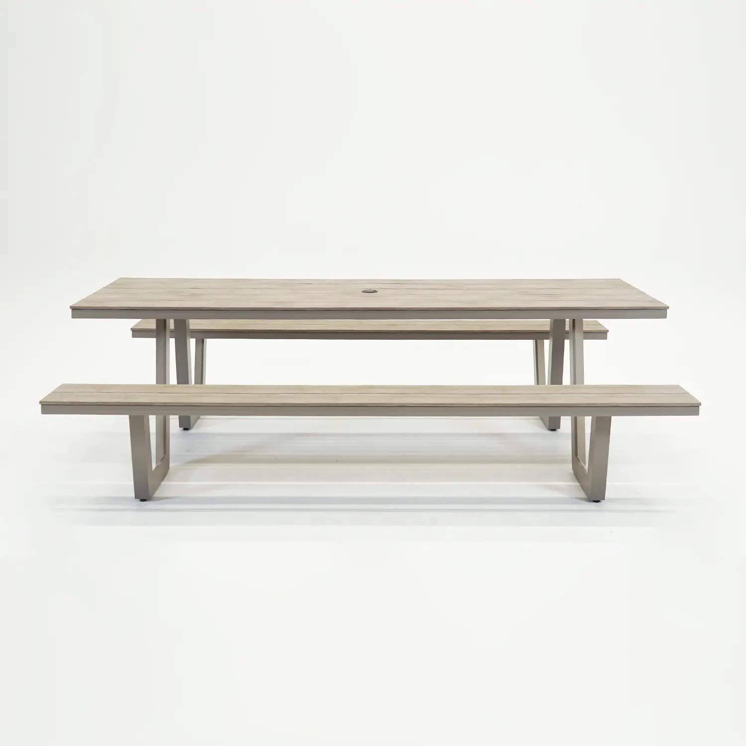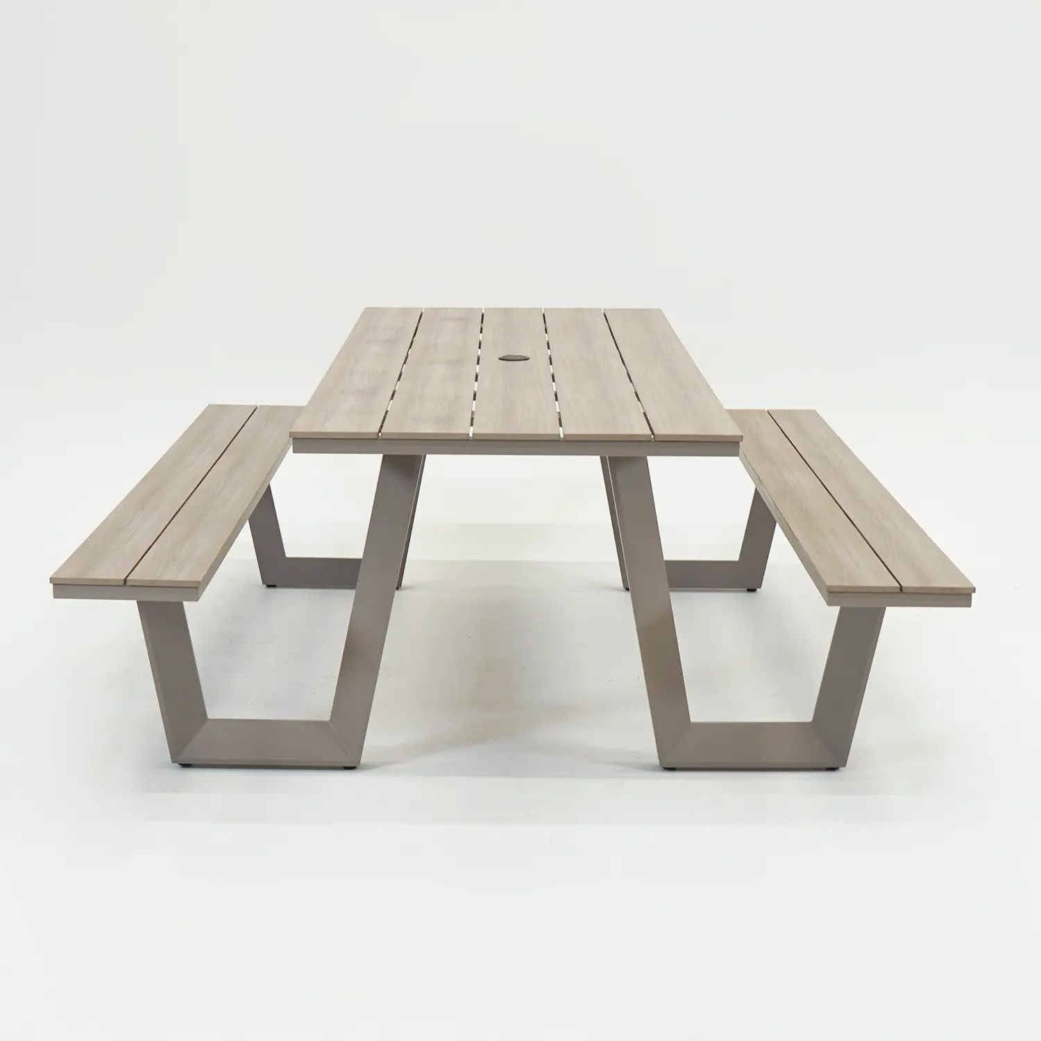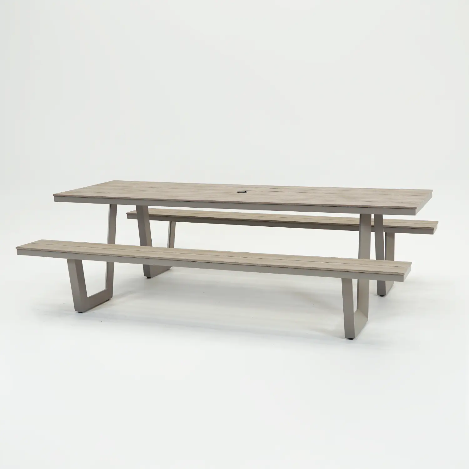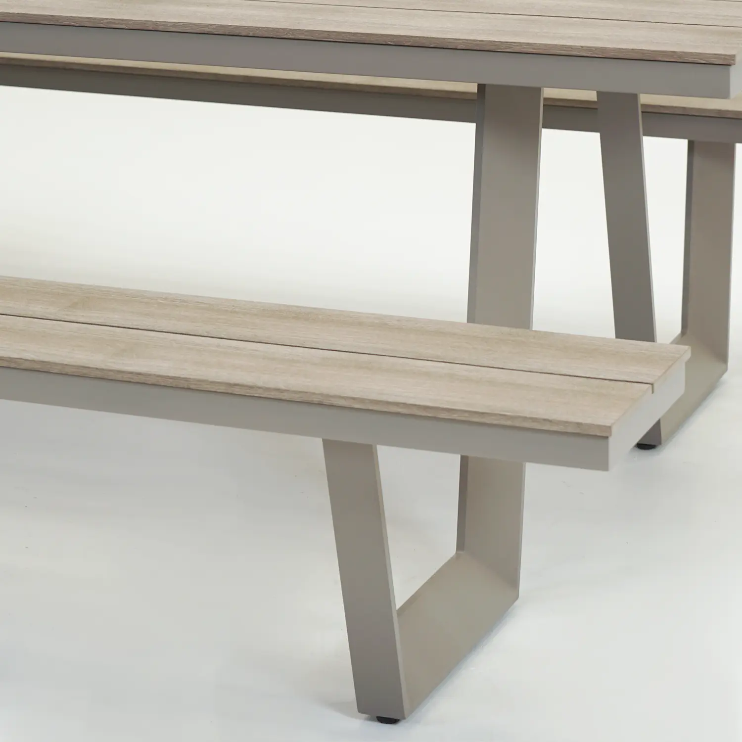 De Vita Massa rechthoekige picknicktafel taupe XL is vervaardigd uit duurzame en weerbestendige materialen. Het frame is gemaakt van gepoedercoat aluminium, wat zorgt voor een lichtgewicht en toch robuuste basis. Het tafelblad en de zitvlakken zijn uitgevoerd in gepoedercoat polywood — een materiaal dat de warme uitstraling van hout combineert met de voordelen van kunststof. Daardoor is de tafel eenvoudig schoon te maken, sterk en bestand tegen regen, zon en wind. Dankzij de extra poedercoating heeft het materiaal een langere levensduur en blijft de kleur mooi, zelfs bij veel buitengebruik.